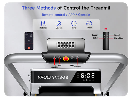 The upgraded LED display with acrylic panel is more scratch-resistant, can maintain a clear display for a long time use. The foldable treadmill for home comes with portable buttons on top of the handrail, and you can control the incline treadmill through the portable buttons, smart remote control or YpooFit APP, which will record your workout data and provide you with a variety of personalized classes to make exercise more fun