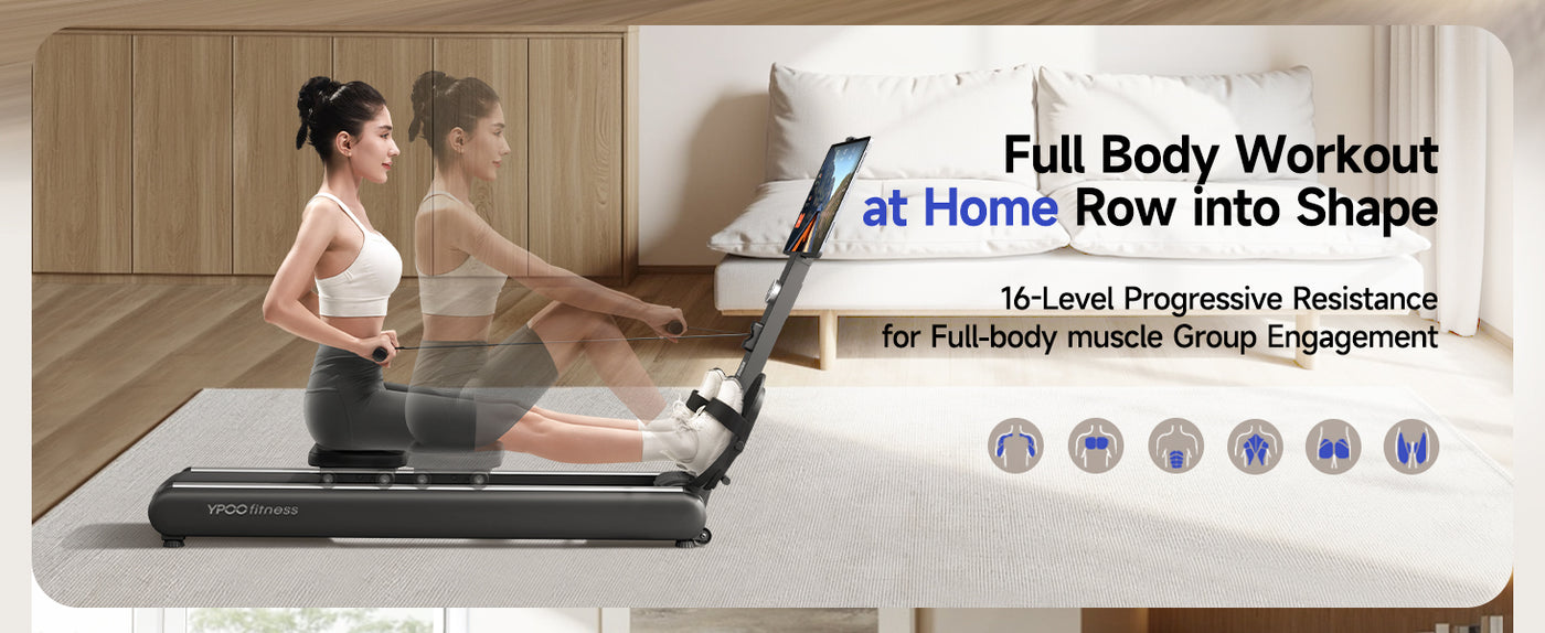 - 【16-Level Quiet Magnetic Resistance】The YPOO rowing machines for home gym equipment features a smooth, silent flywheel with 16 adjustable resistance levels, offering an effective full-body workout that activates up to 90% of your muscle groups. Whether you're a beginner or a professional, levels 1-8 on the folding rowing machine are ideal for maintaining overall vitality, while levels 9-16 are designed to support more intensive training and advanced fitness goals.