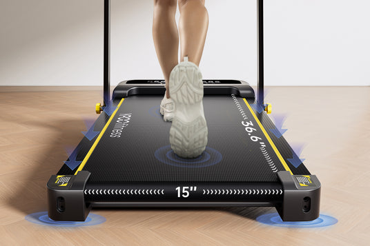 This walking pad treadmill features a 5-layer non-slip running belt(36.6" x 15"), providing excellent cushioning to protect your knees and joints. With an advanced frame structure and shock-absorbing system, walking pad treadmill with handle bar make it easy to maintain and store. For optimal performance, use lubricant before your workout.
